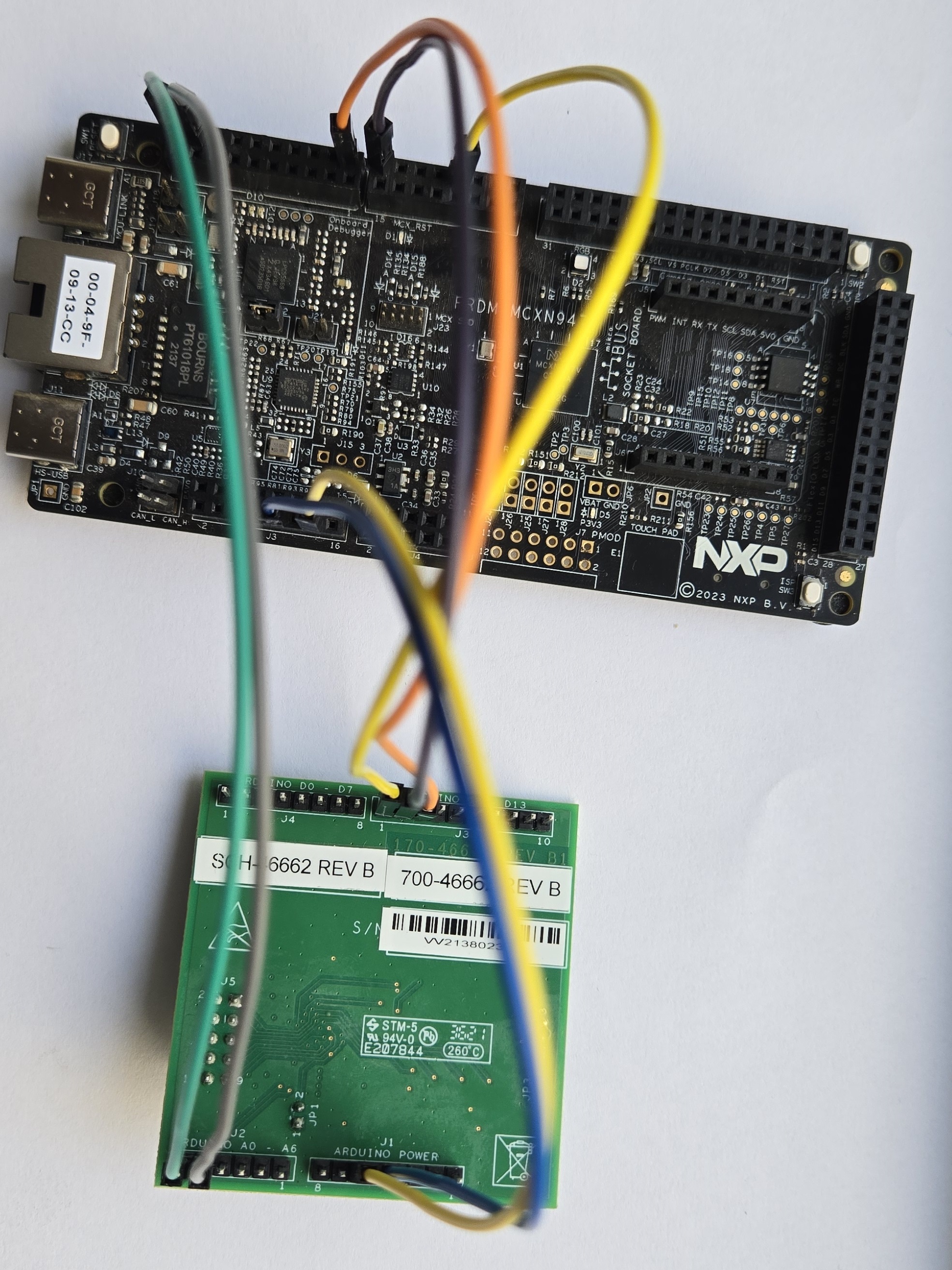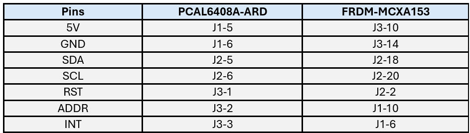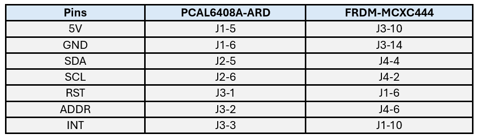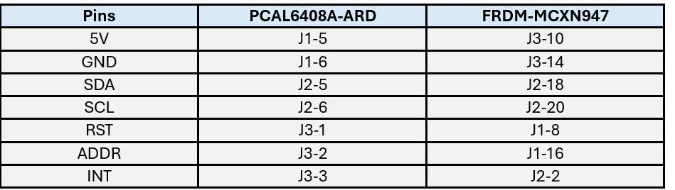 - 将所选示例项目硬件:FRDM-MCXN947/FRDM-MCXA153/FRDM-MCXC444 与 PCAL6408A-ARD 连接