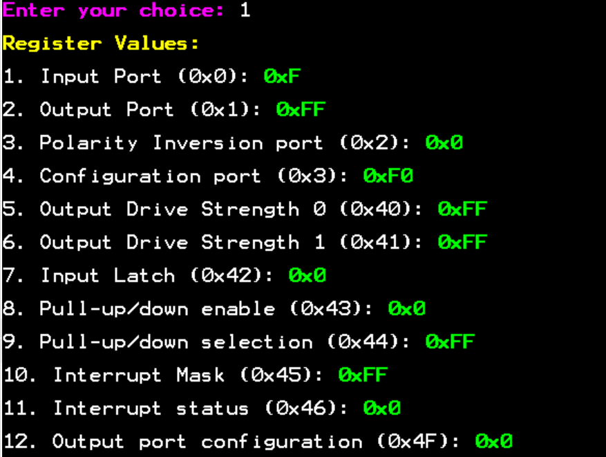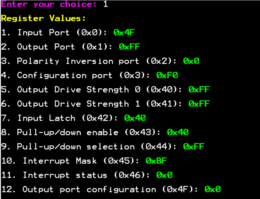 - 所有 PCAL6408A 系统寄存器的默认值将以十六进制格式打印: