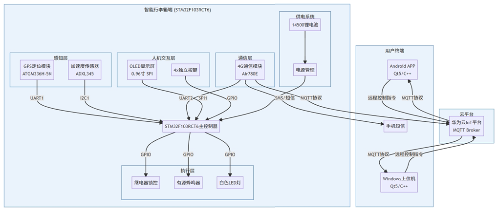 该系统设计以STM32F103RCT6为主控芯片,实现智能行李箱的定位与防盗功能。硬件采用洞洞板制作,通过焊接和杜邦线连接各模块,包括OLED显示屏、4G模块、GPS模块、加速度传感器、蜂鸣器、LED灯、继电器锁和机械按键。系统通过14500锂电池供电,并支持太阳能扩展,确保户外使用的可持续性。