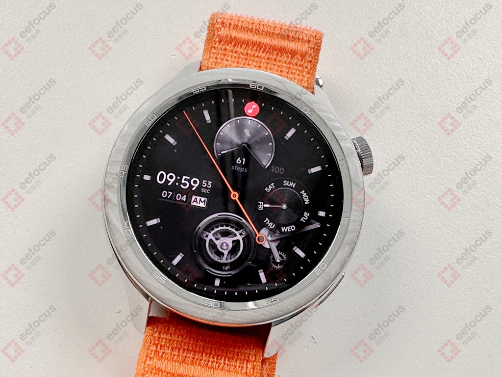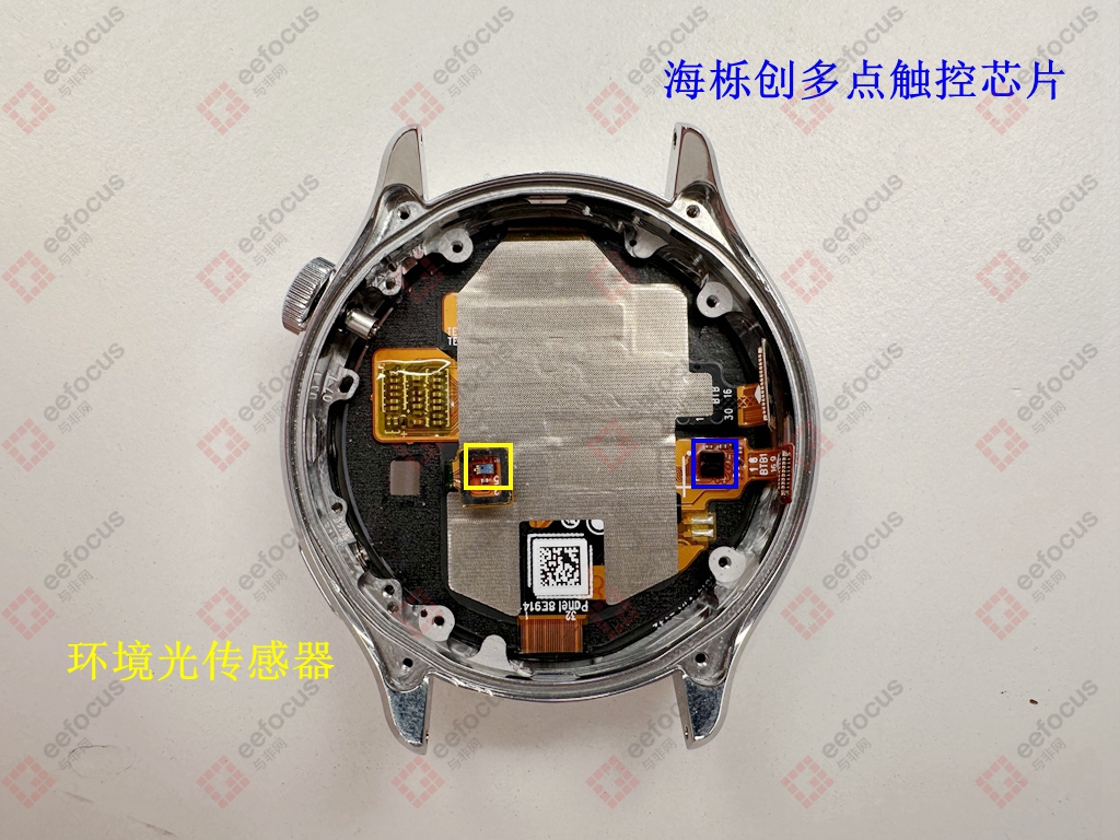 屏幕+表盖这部分,屏幕为1.43英寸的AMOLED屏幕,466x466分辨率。屏幕背部内侧的环境光传感器,主要呢用于检测环境亮度而后调节屏幕亮度。