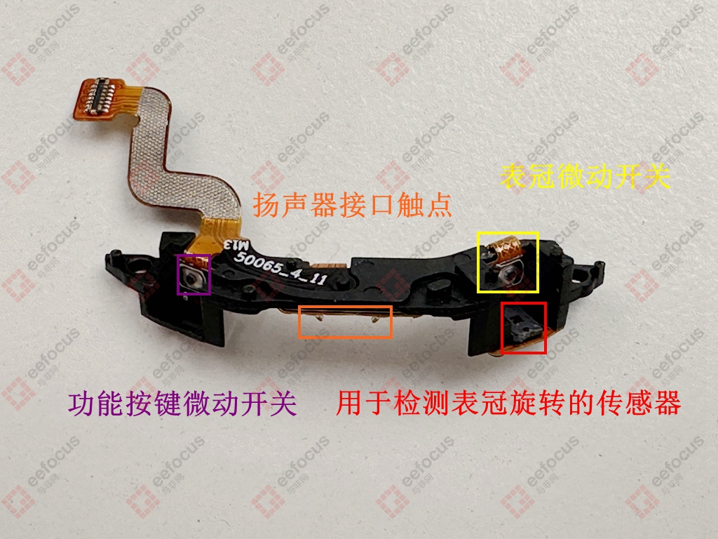 表冠和功能按键的电路是通过板对ban连接器与主板连接的。在实际的电路中,表冠这里有一个光学传感器,用于检测表冠的旋转,此外还有一个微动开关,实现表冠的按压动作,这种设计确实要有天马行空的想象力。另外一侧功能按键直接通过微动开关控制,另外这部分电路上还包含扬声器的两个触点接口,通过触点连接布局在后盖的扬声器单元。