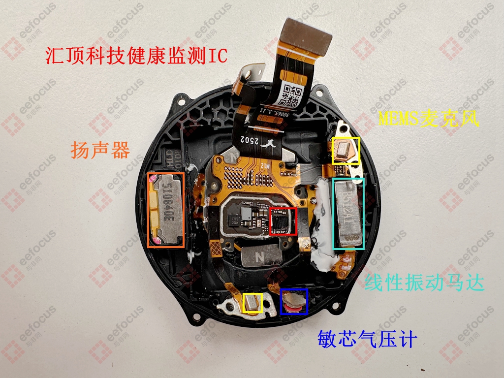后盖上最大的电路应该是心率监测模组,采用了汇顶科技的健康监测IC,型号是GH3020,集成了多通道PPG,具备心率、心率变异性和血氧饱和度等监测功能。