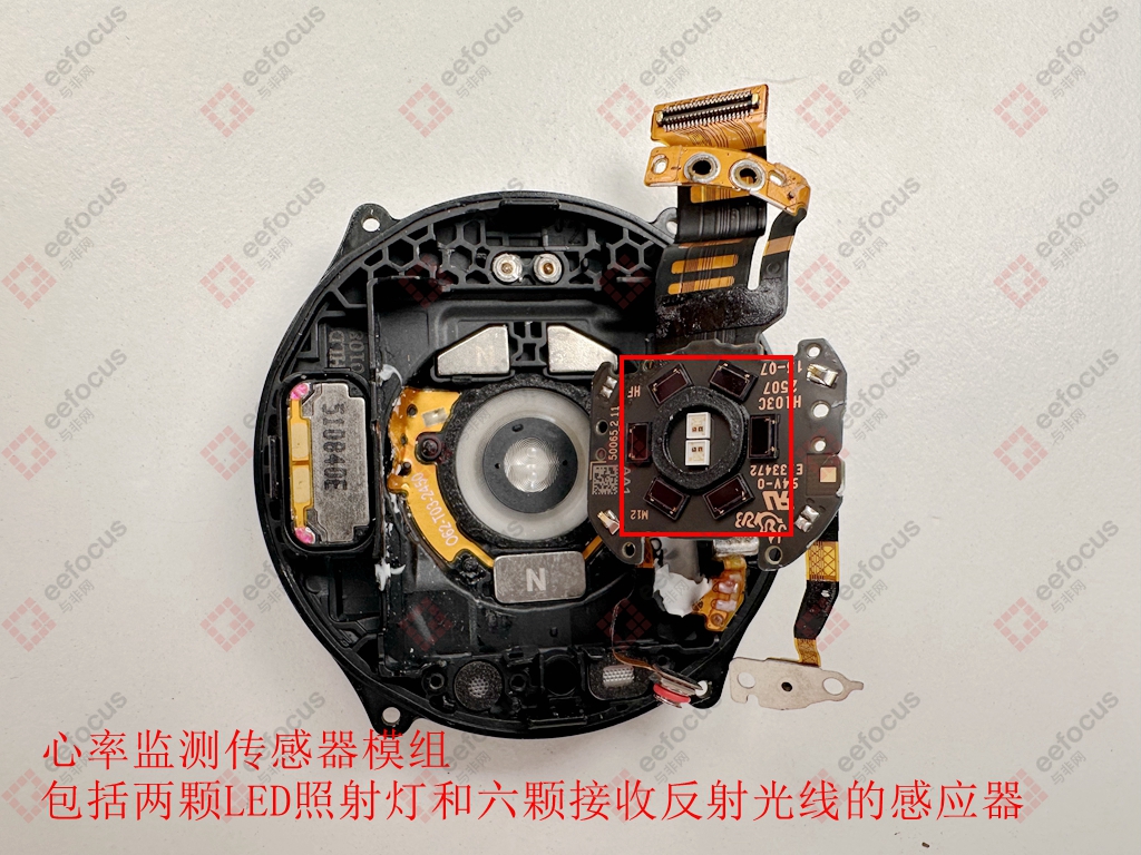 在心率监测模组PCB板背面则是具体的监测传感器阵列,包含了两颗LED照射灯和六颗接收反射光线的感应器。