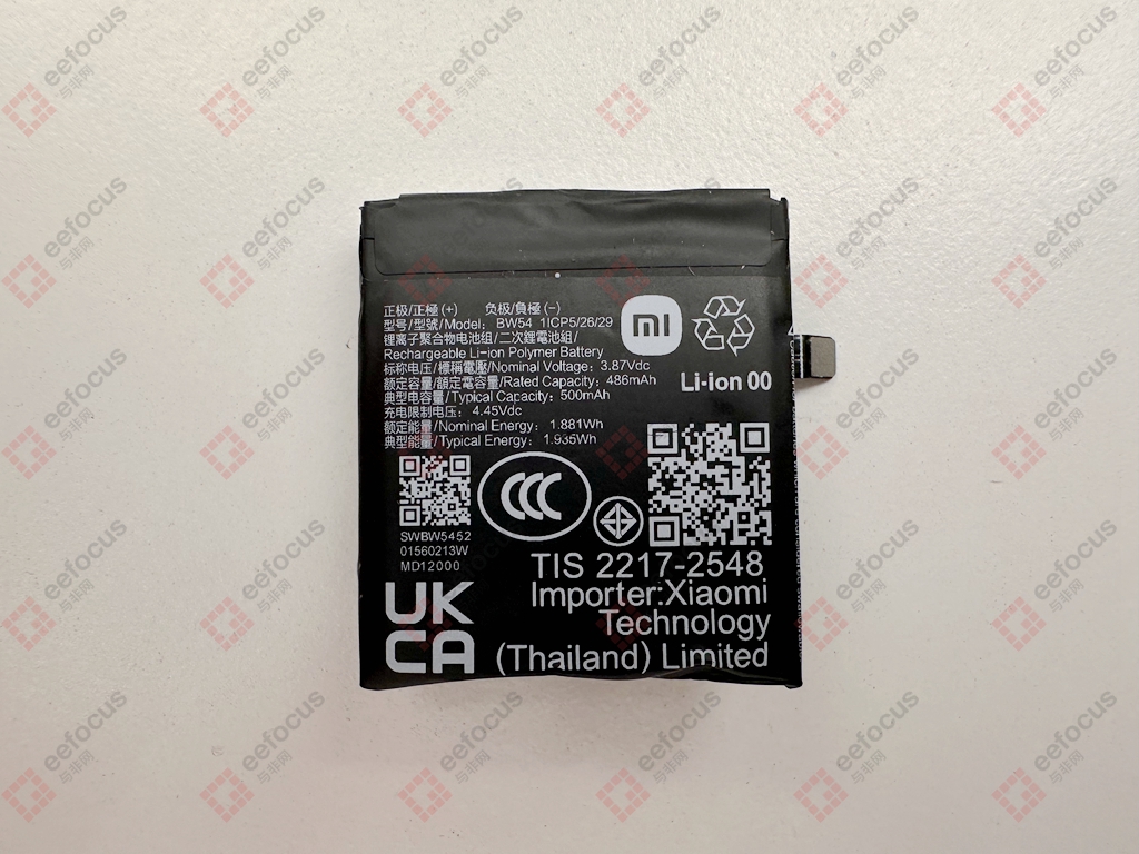 小米手表的电池采用486mAh容量的可充电锂电池。在电池背部有1个塑料结构件,从布局上看是为了防止后盖上的元器件挤压电池。