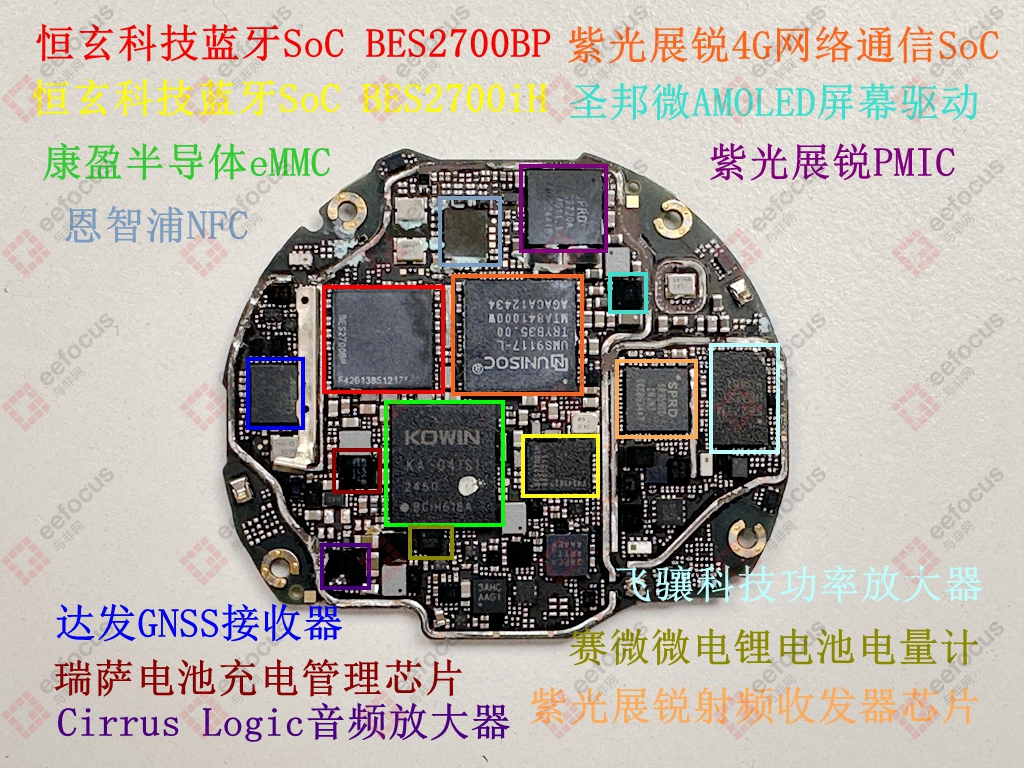 其中我觉得最有意思的地方就是采用了两颗恒玄科技的蓝牙SoC,BES2700BP以及BES2700iH,为什么一个智能手表上会用到两颗恒玄科技的蓝牙SoC?为此我特意比较了下这两颗蓝牙SoC参数,发现还真有大不同,BES2700BP是一款高性能蓝牙可穿戴系统级芯片,集成了像CPU子系统、可选的DSP、音频编解码子系统、Sensor Hub、蓝牙双模5.4、高级图形功能等外设功能接口,可以提供强劲的应用处理能力。而BES2700iH无论是在CPU性能还是一些功能上,如Sensor Hub,图形处理都不如BES2700BP。由此不难推测,BES2700BP这颗蓝牙SoC作为主应用处理器,深度参与传感器数据采集处理,图形界面的实现,主管运算和系统;而BES2700iH作为专职的蓝牙通信连接,让主处理器更加专注,同时也能优化功耗控制和续航表现??,要说唯一的缺点,费成本吧,一般厂商还真不会这样做。